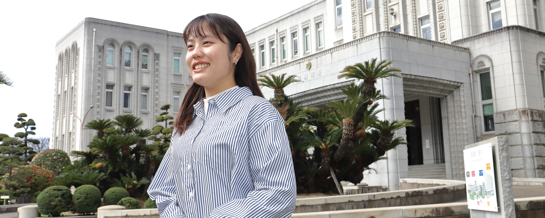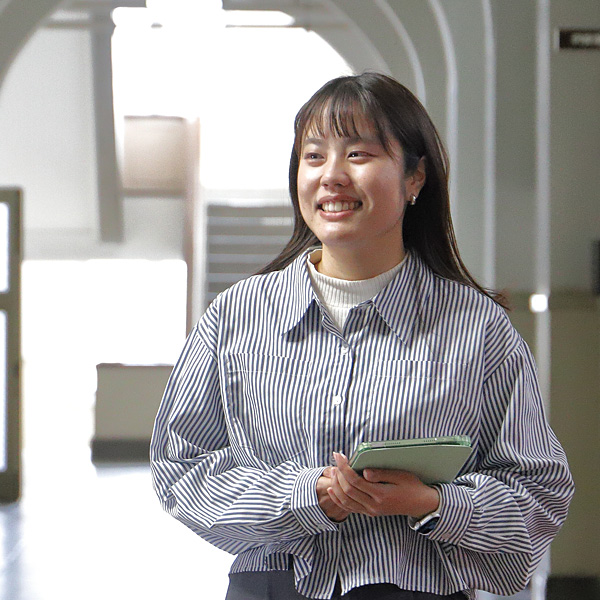 從高中畢業的時候開始,就想在當地的愛媛縣內就職。選擇愛媛縣職員是因為升入下關市立大學時再次認識到了愛媛縣的魅力。愛媛縣出身的人想從事“想從縣外回來”、“想一直住下去”的街道建設,這是最大的理由。現在在產業政策課,從事縣內企業的海外展開支援、縣產品的海外銷路開拓、縣有設施的管理運營等工作。例如,在日冕災禍中,舉辦了向澳大利亞的人們介紹愛媛本地酒的線上酒窖參觀旅行,得到了很高的評價,感到很有價值。回顧學生時代,讓人想起在課堂上進行的實地研修和以地區課題為主題的研討會等。分析課題,考慮課題解決的手段的機會有很多,培養了客觀、寬廣的視野思考事物的能力。這個能力在入廳後的各種各樣的課題的解決上發揮了作用。現在,著眼於進一步振興產業,為了接受“韓文能力檢定”的檢查,傳達縣產地酒的魅力,也挑戰了取得“酒文憑認定”。