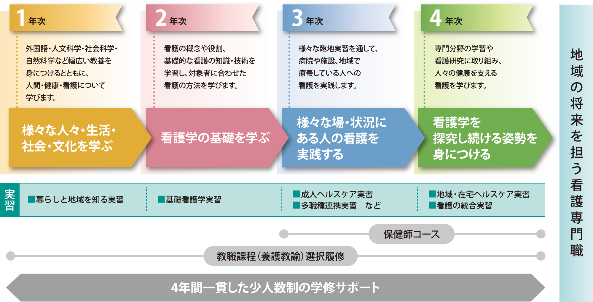 - 在實地實習中,活用與地域密切相關的公立大學的特性,以“了解生活和地域的實習”為首,通過在下關及周邊地區進行實地實習,培養地域居民健康思考能力的基礎。另外,在各種各樣的保健醫療福利場所,為了理解護理的專業性,掌握與多職種合作、協作的能力,在3年後的實地實習的最後配置了“多職種合作實習”。並且,在4年後的“護理的綜合實習”中,自己設定實習課題,通過實踐來培養作為護士專業人員的倫理觀、使命感、提高護理實踐能力的自我鑽研能力。