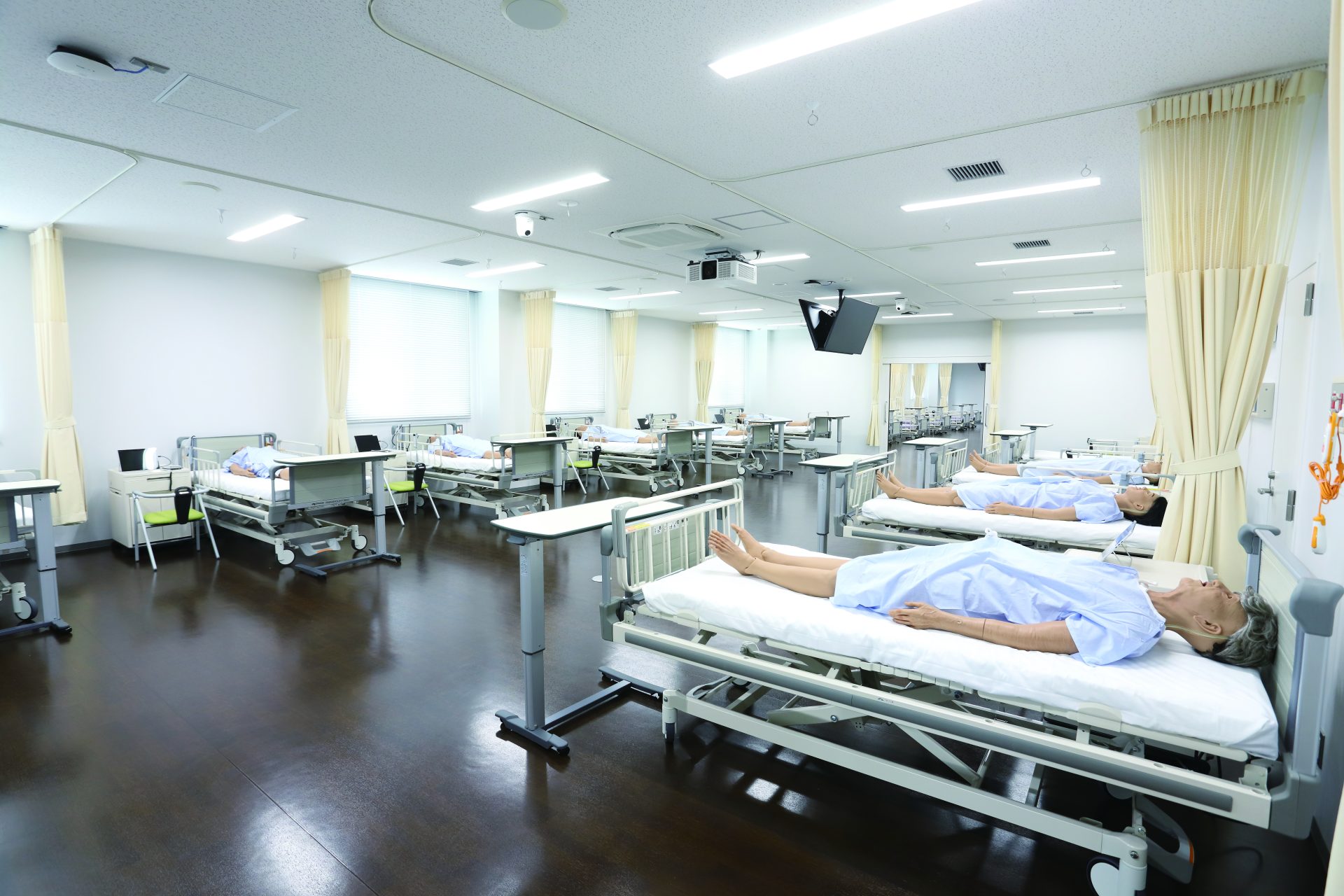 護理學院新校舍不僅設置了講義室,還設置了護理學實習室和技能實驗室等,導入了使用多數高功能模擬器的模擬教育,作為模擬患者,通過下關地區的居民參與進行有真實感的護理技術教育。另外,為了促進學生的小組工作等主體性的學習,設置了很多研討會室和演習室。