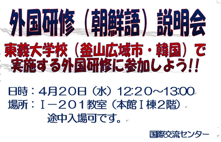 主頁 2016年度舉辦外國研修B(朝鲜語)說明會 下關市立大學 TOPICS 通知 #國際交流 2016年度舉辦外國研修B(朝鲜語)說明會 這是在南韓東義大學校舉行的今年夏天外國研修B(朝鲜語)的說明會。詳細說明必要經費、日程、東義大學校的魅力等。請務必參加。 舉辦日期:2016年4月20日(週三)12點20分~13點00分內容外國研修B(朝鲜語)的詳細說明地點Ⅰ-201教室(本館I棟2樓)對象:本校學生參加費:免費 [刊登日期:2016.4.13] 咨詢地址 公立大學法人下關市立大學 學務集團國際交流中心 TEL. 083-254-8693 / FAX. 083-252-8099