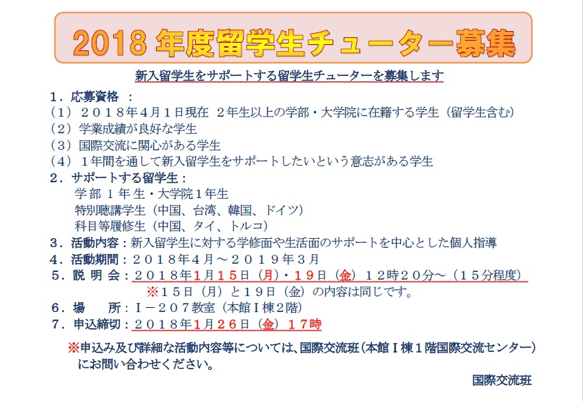 為新進入下關市立大學或開始短期留學的外國留學生提供學習和生活支援的留學生導師招募如下!!