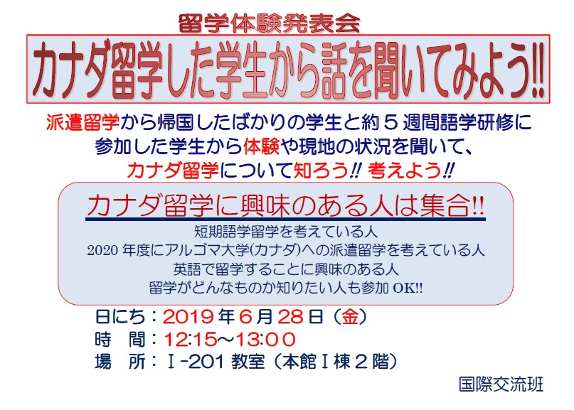 內容聽了向加拿大派遣留學約1年的學生和利用春假留學約5周的學生的話。也有疑問回答。
