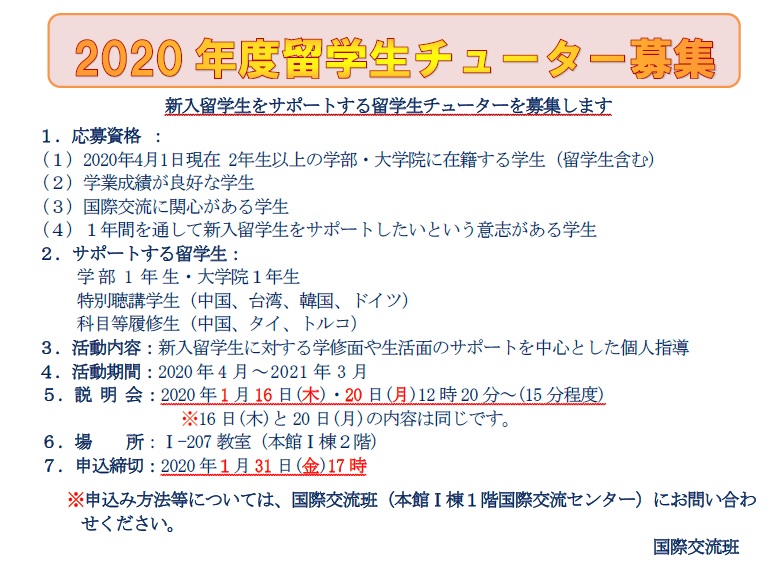 為新進入下關市立大學或開始短期留學的外國留學生提供學習和生活支援的留學生導師招募如下!!