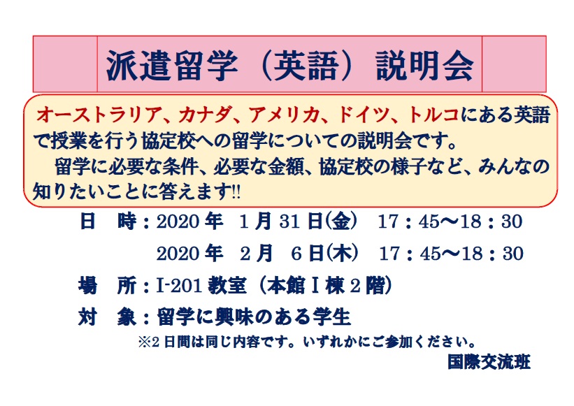 主頁 舉辦派遣留學(英語)說明會的介紹 下關市立大學 TOPICS 通知 #國際交流 舉辦派遣留學(英語)說明會的介紹 對用英語留學感興趣的學生請務必參加。 1.舉辦日期和地點 日期2020年1月31日星期五17:45至18:15 2020年2月6日星期四17:45至18:15地點I-201教室 2.內容 (1) 用英語授課的協定學校等的介紹 (2) 用英語留學所需的條件 (3) 答疑 ※ 請在某一天參加。說明內容是一樣的。 3.對象本校學生 [刊登日期:2020.1.23] 咨詢地址下關市立大學 學務組國際交流班 TEL. 083-254-8693 / FAX. 083-252-8099