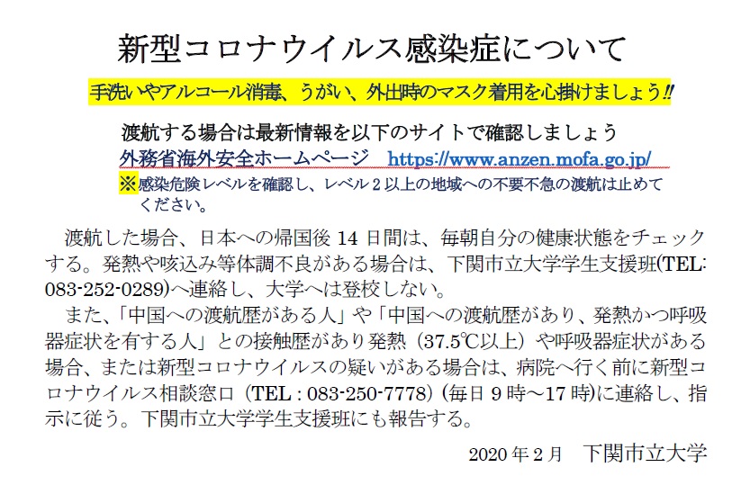如果有感染的擔心等情況,下關市立大學學生支援班(TEL:083-252-0289)也請聯繫。