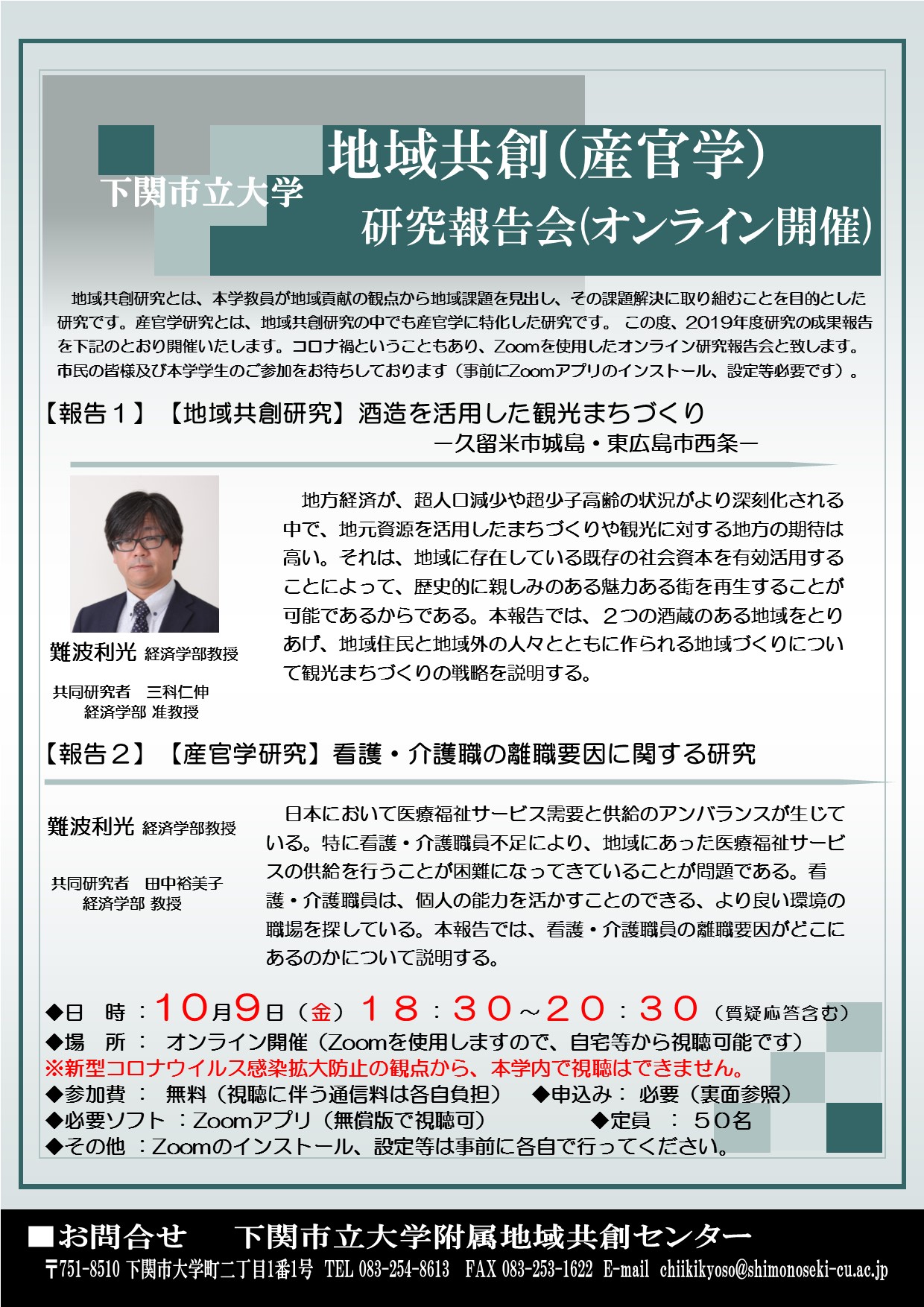 所謂地域共創研究,是本校教師從地域貢獻的觀點發現地域課題,以致力於解決那個課題為目的的研究。產官學研究是在地域共創研究中也專門針對產官學的研究。這次,2019年度研究成果報告將在網上舉行。我們期待各位市民以及本校學生的參與。