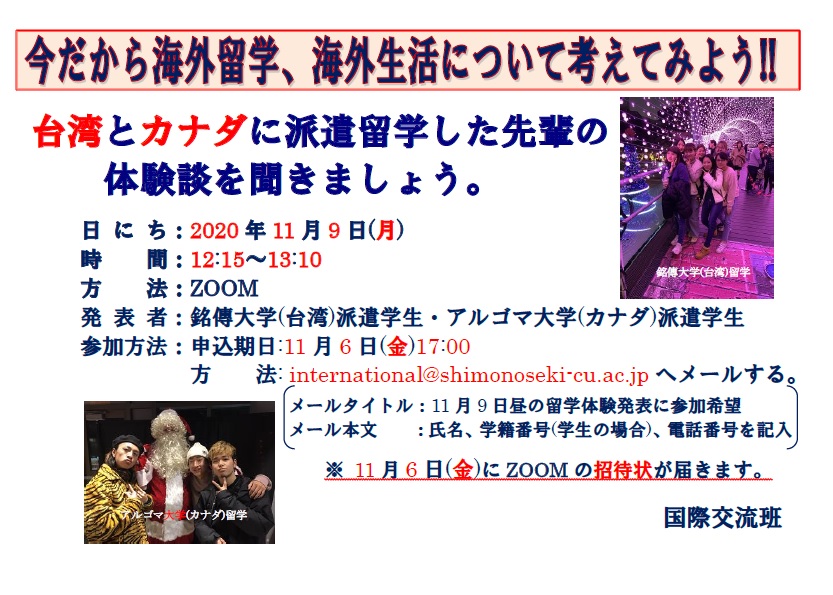 - 海外體驗發表會:聽派遣到台灣和加拿大留學的前輩們的體驗談吧!!