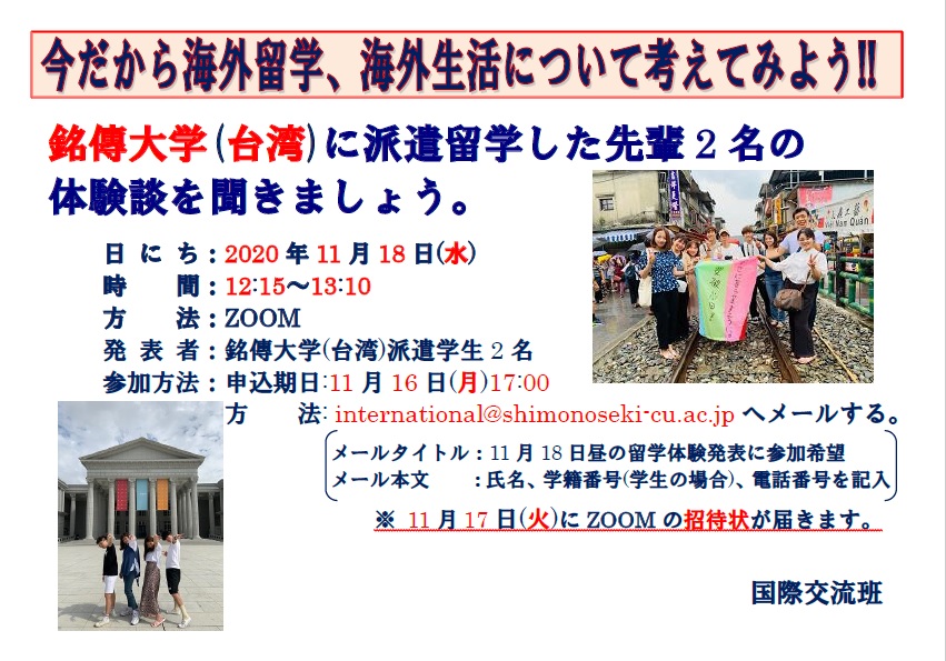 - 留學體驗發表會:聽派遣到銘傳大學(台灣)留學的兩位前輩的體驗談吧