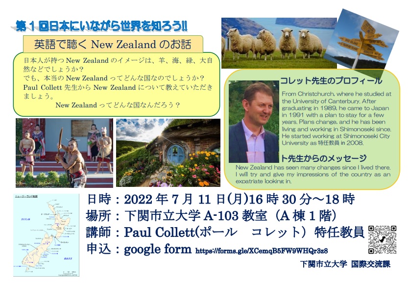 請紐西蘭出身的Paul Collett老師(下關市立大學特任教師)用英語談論紐西蘭的各種各樣的事情。