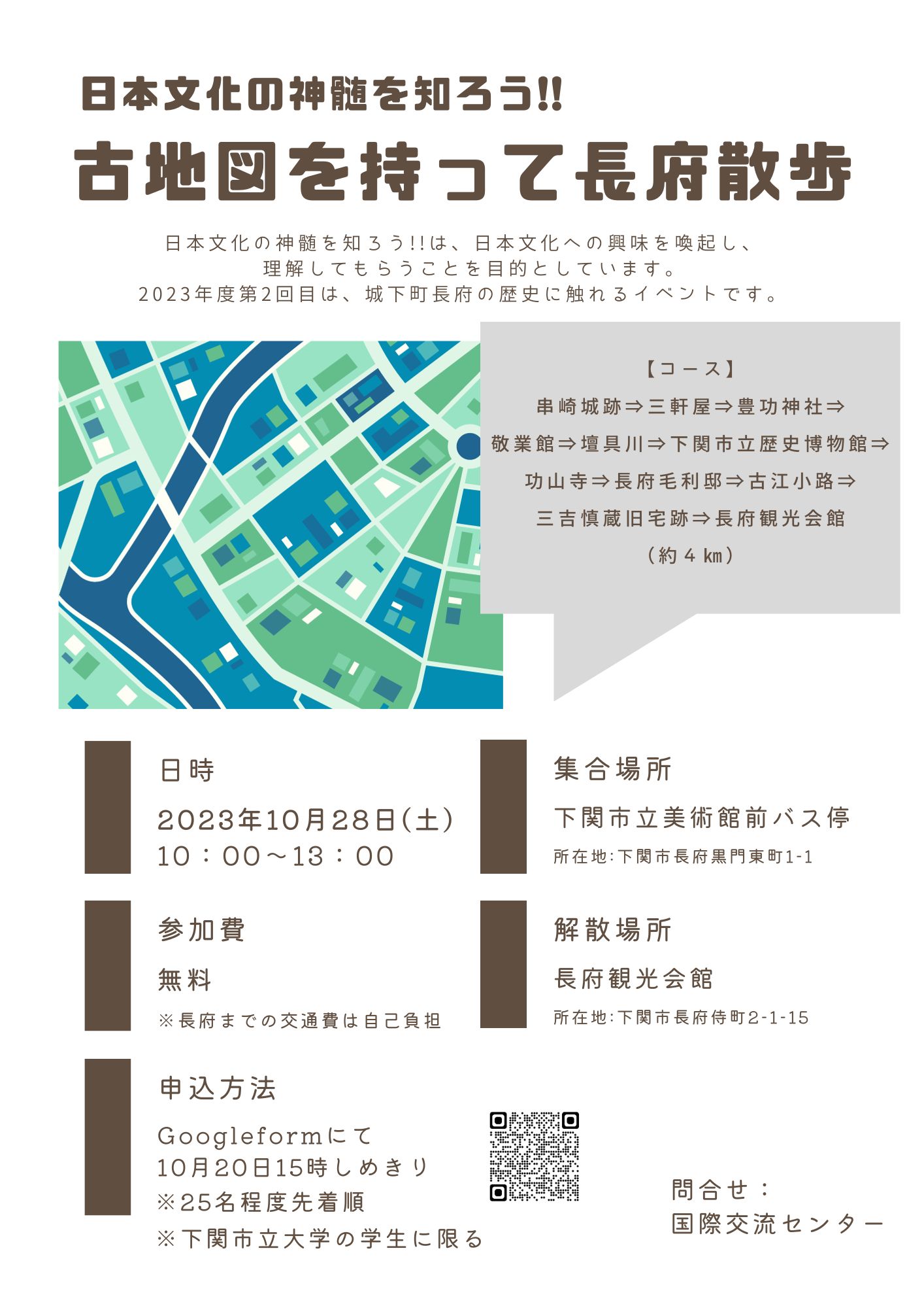 2023年度第2次是~拿著古地圖在長府散步~。在下關長府地區一手拿著古地圖,一邊聽當地導遊的話一邊散步。