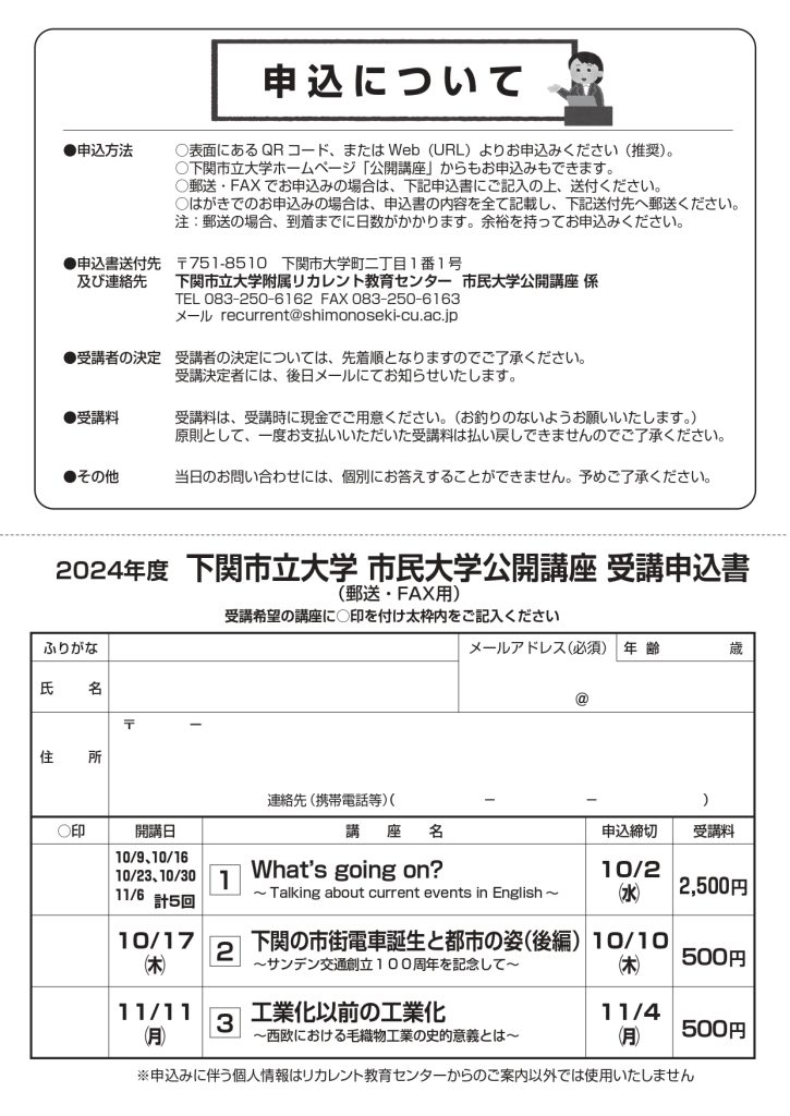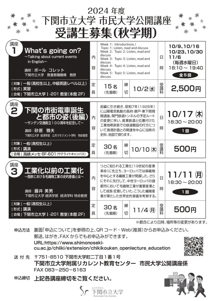 #公開講座【招收聽課生】附屬回流教育中心2024年度下關市立大學市民大學公開講座(秋季學期)