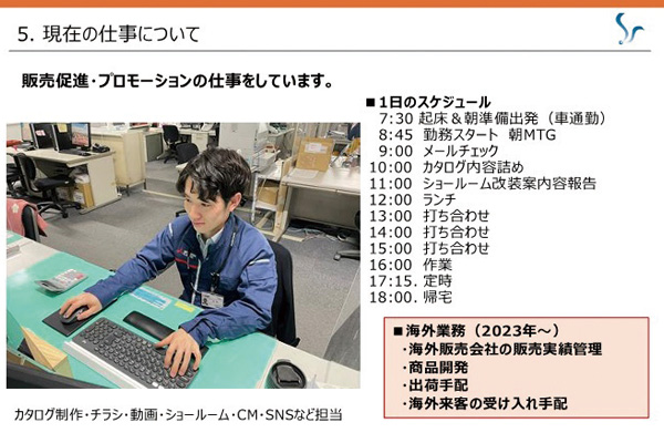 這是一位在校期間有過留學等海外活動經驗的前輩,向我們講述大學時代的經驗在社會上有著怎樣的幫助的職業克拉姆。2024年,包括藤井道德(三菱電機株式會社工作)在內的5名畢業生出席了會議,並通過演講全球職業生涯為學生加油。