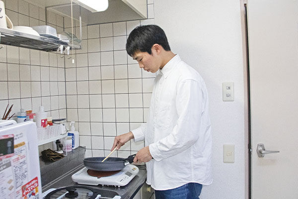 在家裡做飯。平時從早飯開始在大學的食堂吃,但是休息日的時候為了節約而努力自己做飯。最有自信的作品是咖喱。