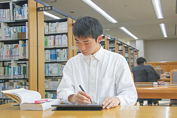 使用空陀螺在圖書館自習中。想找教職的話,科目就會增加。教科書也有厚厚的科目,為了取得學分有效地利用了時間。