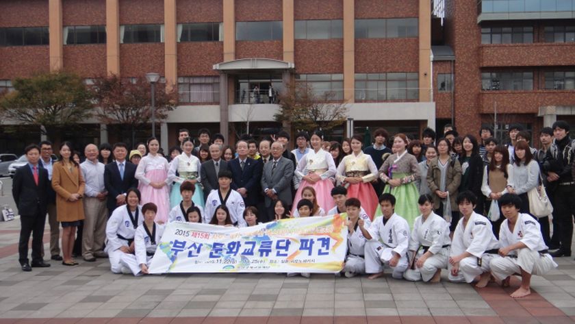 2015年11月24日(週二)12:20~12:50下關市內為前一天舉行的小釜山Festa而來的東義大學校跆拳道示範團和微笑釜山的各位同學來學。東義大學校是本校的交流協定學校,是以此為契機實現的。