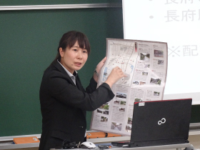 根據去年實施的2件地域共創研究,松本貴文講師以“下關市城市建設運動的現狀和課題”、吉武由彩特任教師以“從城下町長府地區地圖接觸其歷史、文化、社會”為主題進行了研究報告。得到了很多對主題感興趣的市民的參加,提出了活躍的意見和提問等,度過了充實的時間。