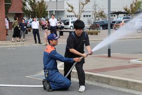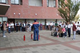 在下關市北消防隊員的指導下,學生、教職員以及大學町自治會居民等約150人參加了防災訓練。