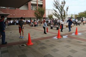 設想為伴隨著放火的火災發生,由本校職員組成的自衛消防隊擔任了各任務,包括面向起火地點進行初期滅火的消防班、將棟內的學生等引導到避難地點校園廣場的避難誘導班、搬運受傷人員和進行應急處理的救護班等。