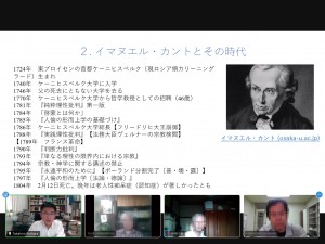 本校經濟學院的桐原隆弘教授就伊曼努埃爾・康德的德語表達,以事先分發的講義資料為基礎,分析了敘述康德思想的文獻等,舉例進行了說明和解說。講座是使用Zoom線上舉辦的。聽講生們在雙向的授課中,一邊看資料一邊熱心地聽著。另外,設置了質疑回答的時間,陳述問題和意見的聽講生也很多。在日冕災禍中,和去年一樣,春學期也在網上舉辦了,但是取得了很大的成果。