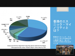 本校都市未來創造戰略機構特任教師石川朝子教師針對移民兒童的教育,著眼於香港公立國小的努力,一邊夾雜照片一邊說明和解說當地調查得知的內容。講座是使用Zoom線上舉辦的。聽講生們一邊看事先分發的資料一邊熱心地聽著。另外,設置了回答質疑的時間,聽講生和講師交換了很多意見。這次的講座也在網上舉辦,非常有成果。
