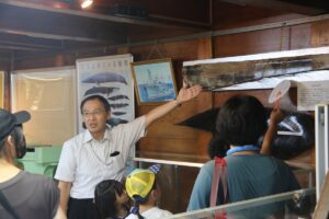 除了講義之外,還參觀了長府庭園內的鯨魚資料展覽室,體驗了抹茶和點心的茶道,內容豐富。