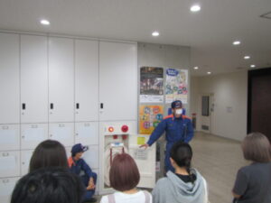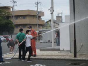 之後,消防隊員對室內消火栓的使用進行了說明,作為在室外活動,進行了使用室內消火栓的放水訓練以及使用水滅火器的滅火訓練。