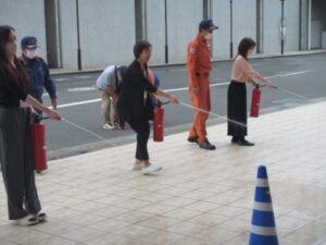 在本館II棟4樓設想為火災發生實施的自衛消防隊活動訓練中,初期消防班和避難誘導班急行在火災警報器發出的報告感知現場,進行了初期滅火和避難誘導。另外,由本校職員組成的自衛消防隊將棟內的學生等引導到避難地點的本館I棟正面玄關前,搬運受傷人員和進行應急處理等任務。