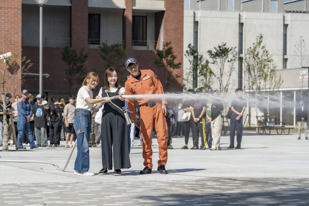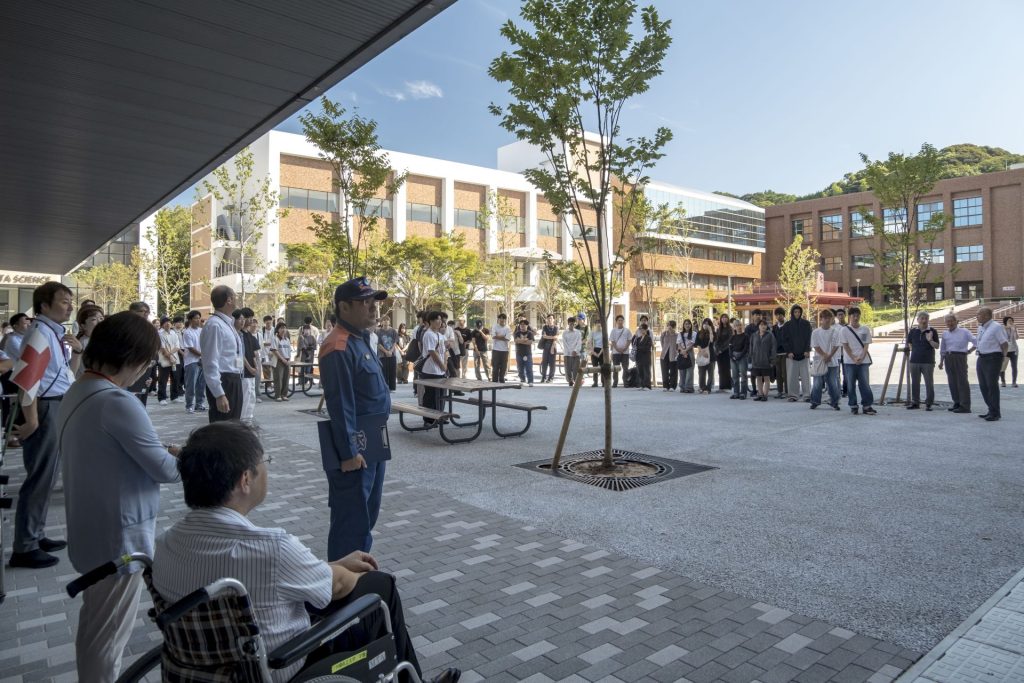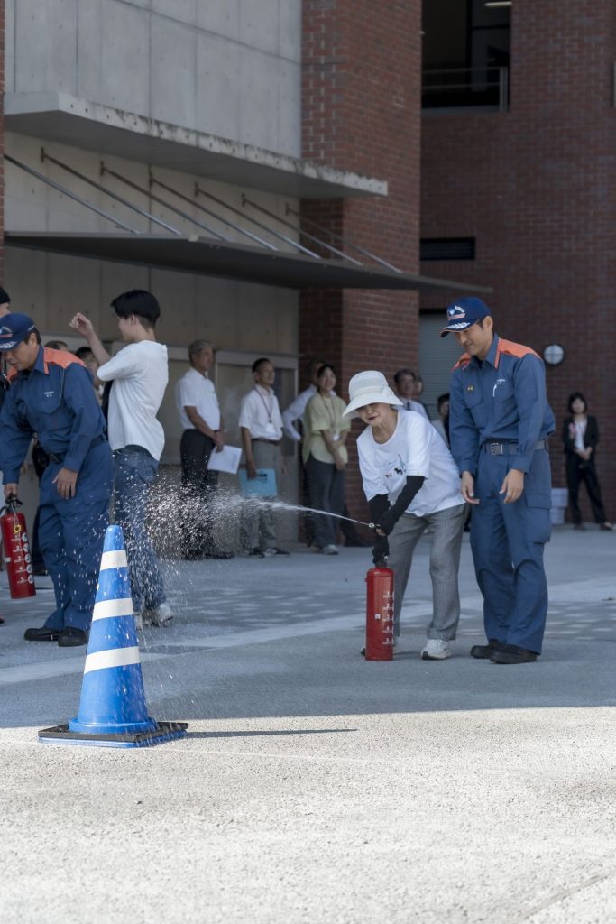 在設想“本館II棟4樓火災發生”實施的自衛消防隊活動訓練中,初期消防班和避難誘導班緊急前往火災警報器發出的報告感知現場,進行了初期滅火和避難誘導。另外,由本校職員組成的自衛消防隊將棟內的學生等引導到避難地點的本館II棟揭示板前廣場,搬運受傷人員和進行應急處理等任務。