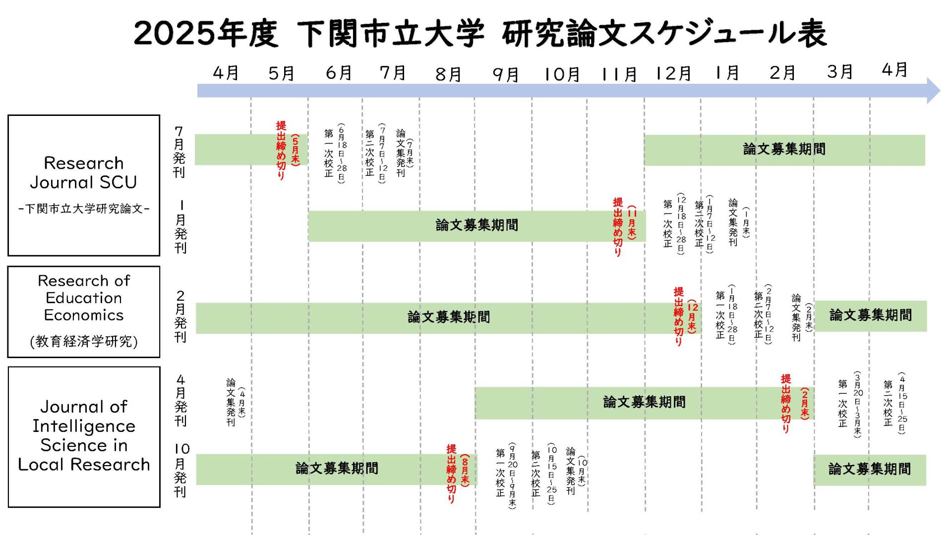 Research Journal SCU被定位為下關市立大學的紀要,為了讓本校的教師能夠向社會傳遞更多的研究成果而發行。
